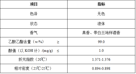 2、在白酒中,為清香型的主體香,其含量可高達(dá)2326mg/kg;在濃香型白酒中其含量在1000-1500mg/kg之間。其嗅感和味感在50% (V/V)脫臭乙醇中,1000mg/L時(shí)似醚香、果香,味辣、澀;100mg/L時(shí)略有醚樣、有淡的果香。
